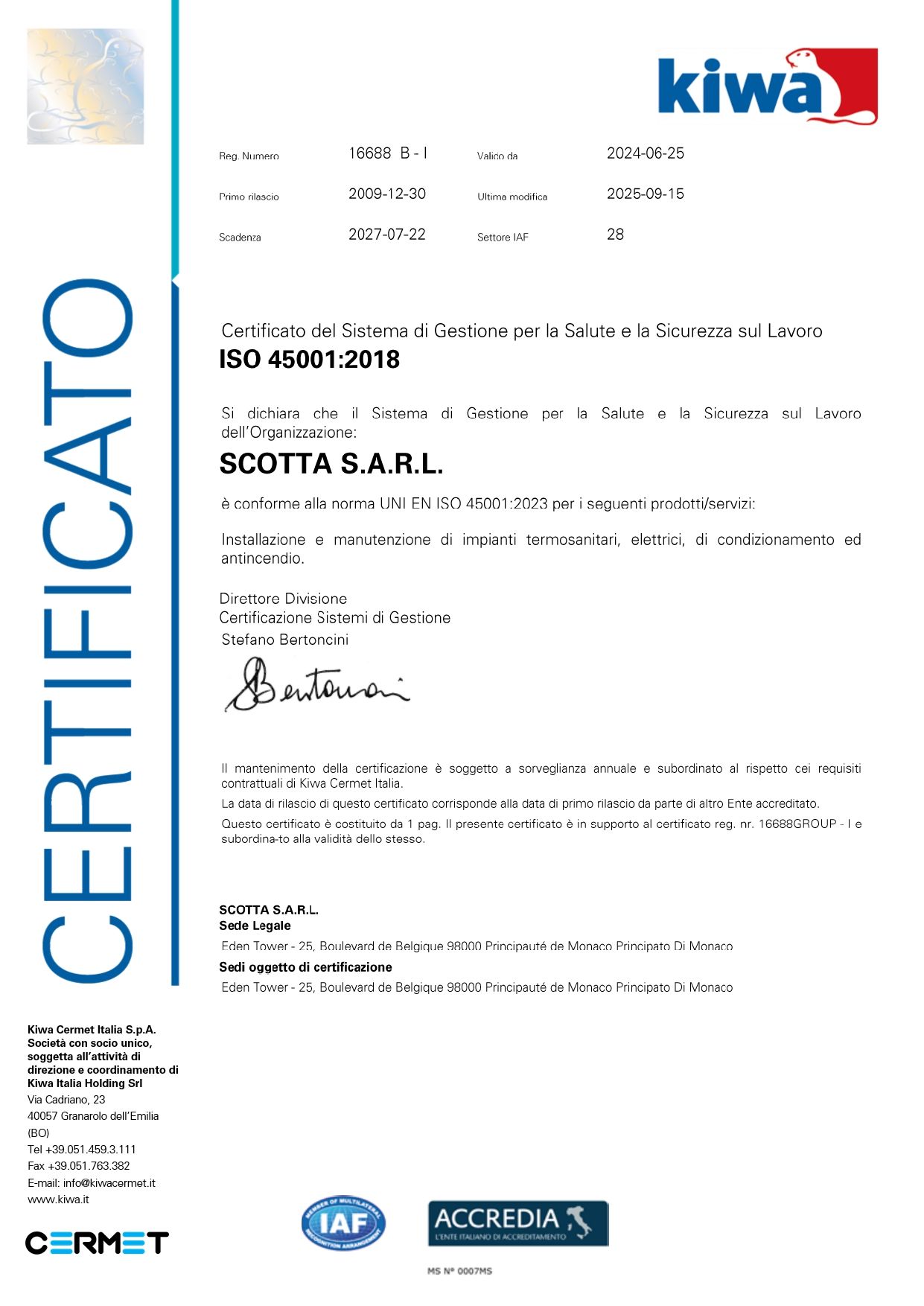La società Scotta S.a.r.l. viene costituita a dicembre del 2011 con sede nel Principato di Monaco, dotata di propri uffici e magazzino nonché di personale tecnico, amministrativo e operativo.
