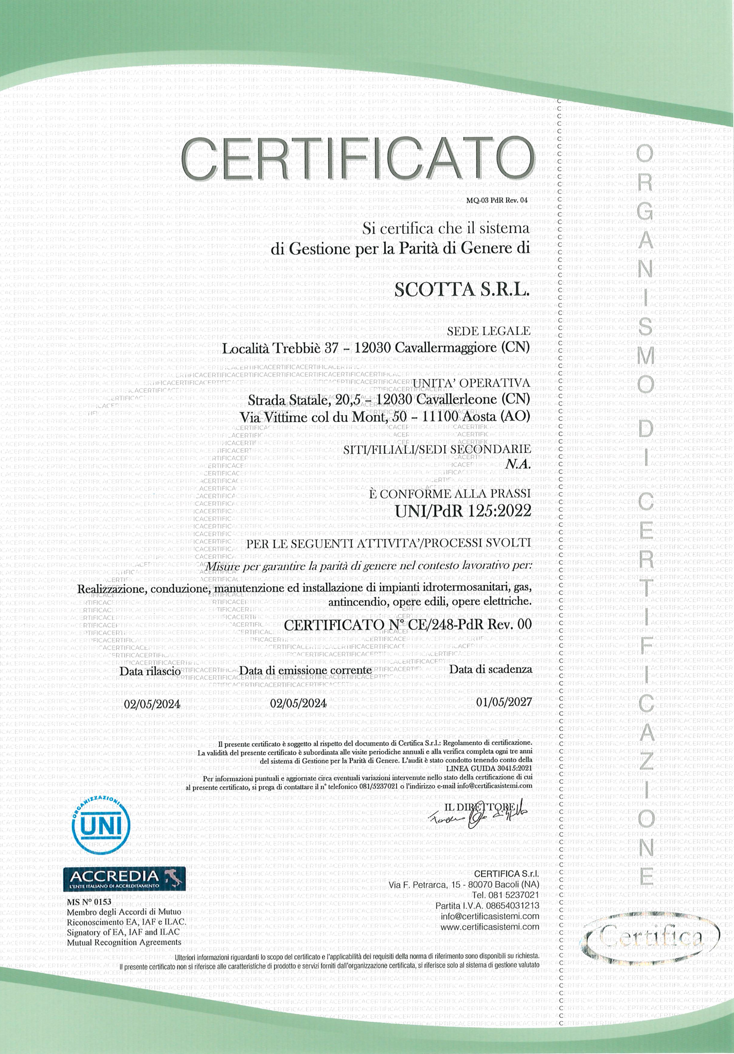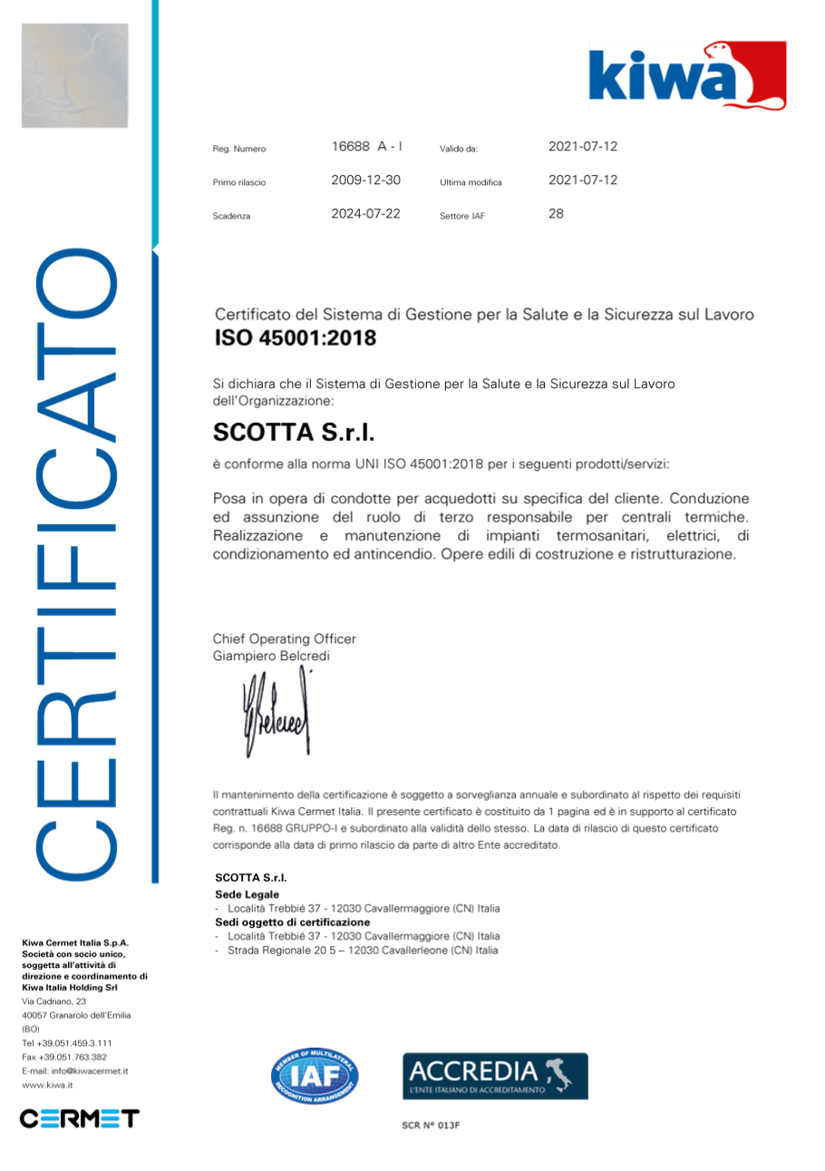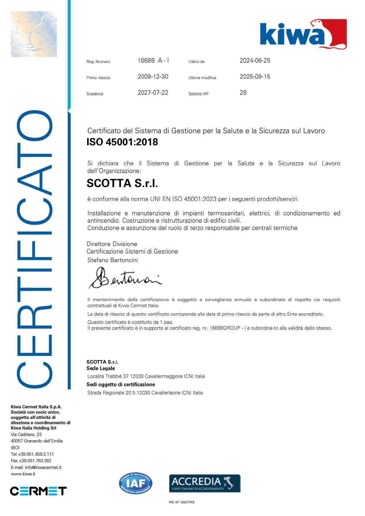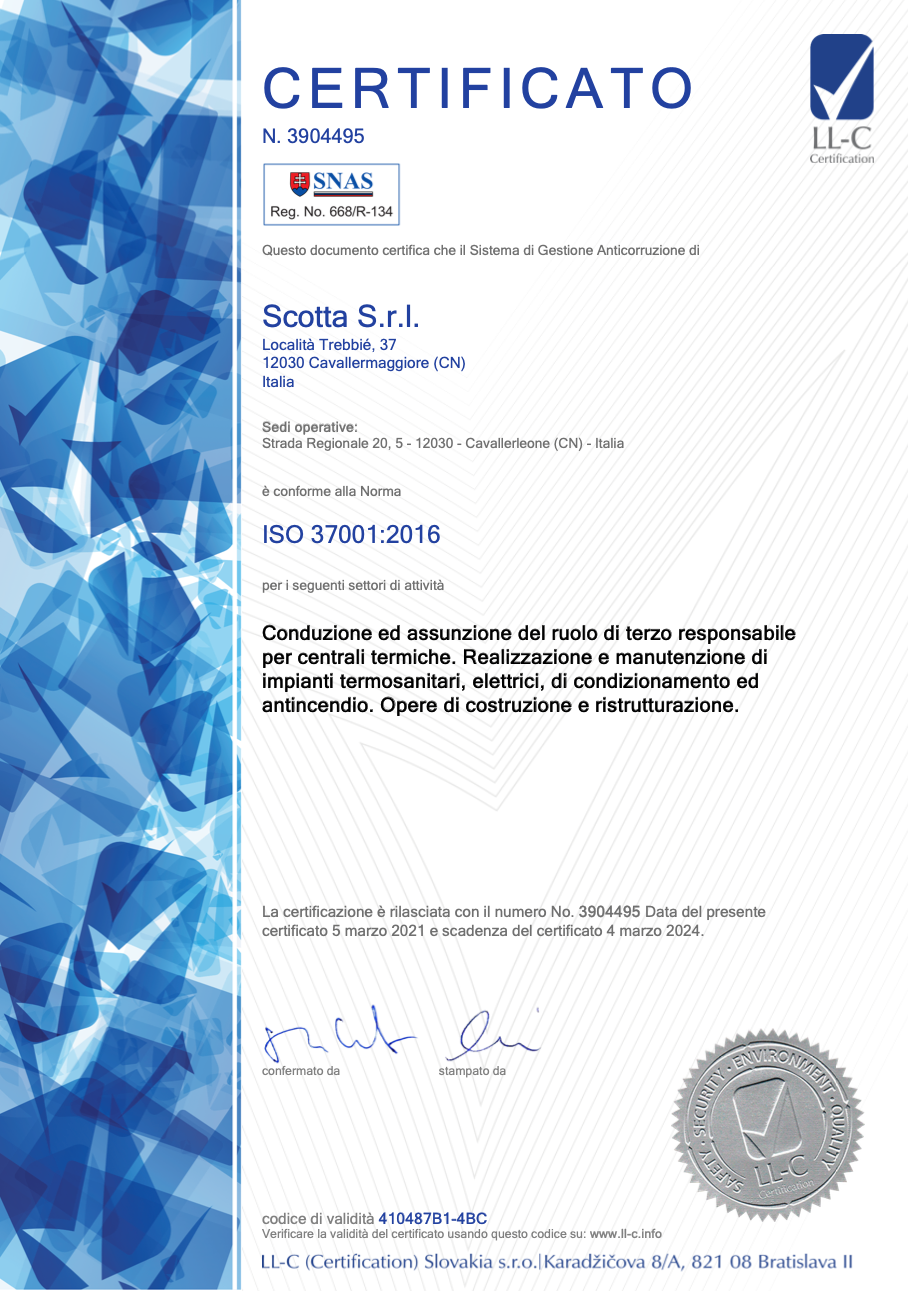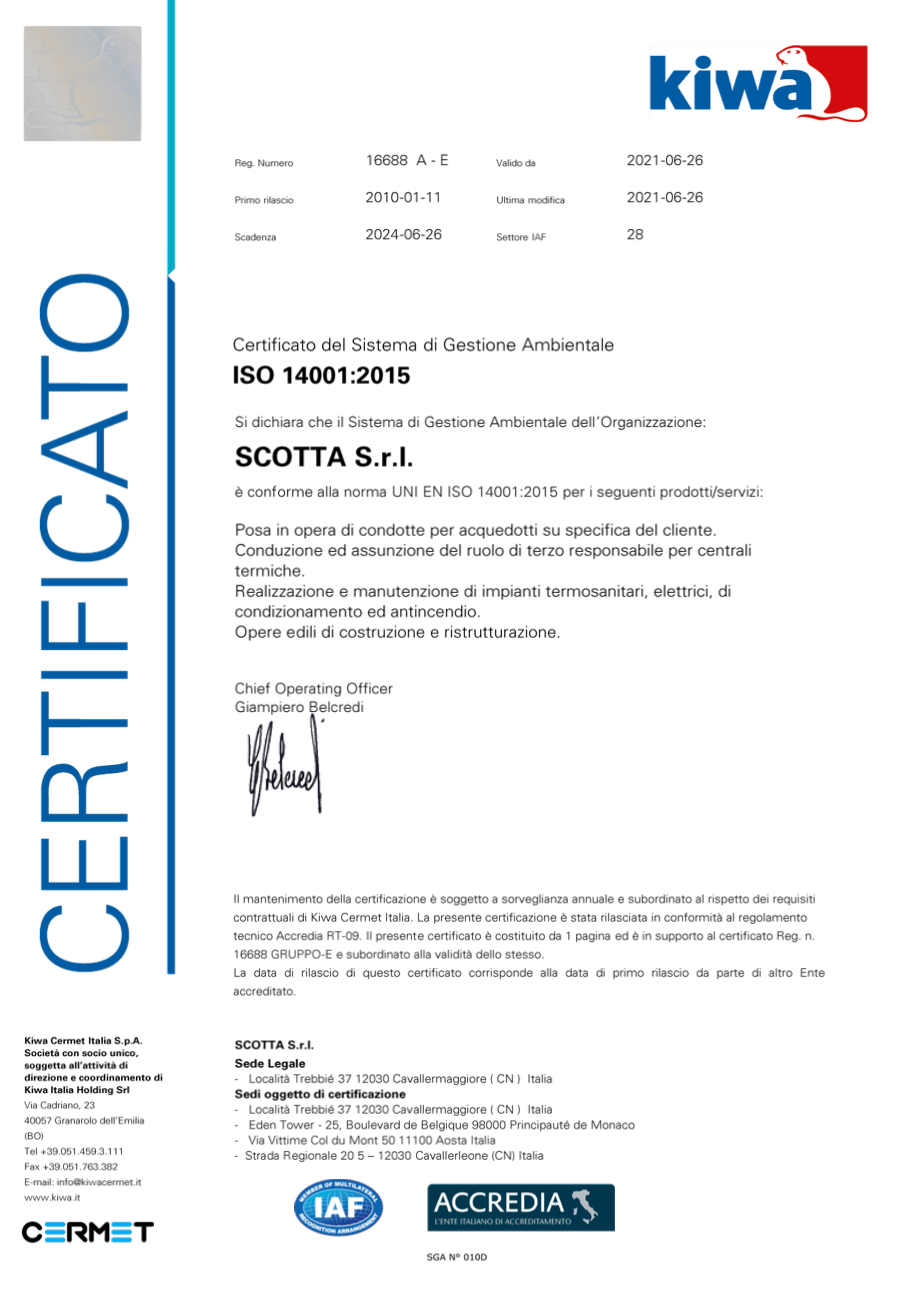 Al fine di migliorare i livelli di tutela della sicurezza della salute dei lavoratori, la Scotta S.r.l. si è adeguata agli standard della norma OHSAS 18001:2007 ottenendone la certificazione; parallelamente, nell'impegno concreto di minimizzare l'impatto ambientale dei propri processi e servizi e nell'ottica di salvaguardare l'ambiente, l'azienda si è certificata alla Norma UNI EN ISO 14001:2015.
