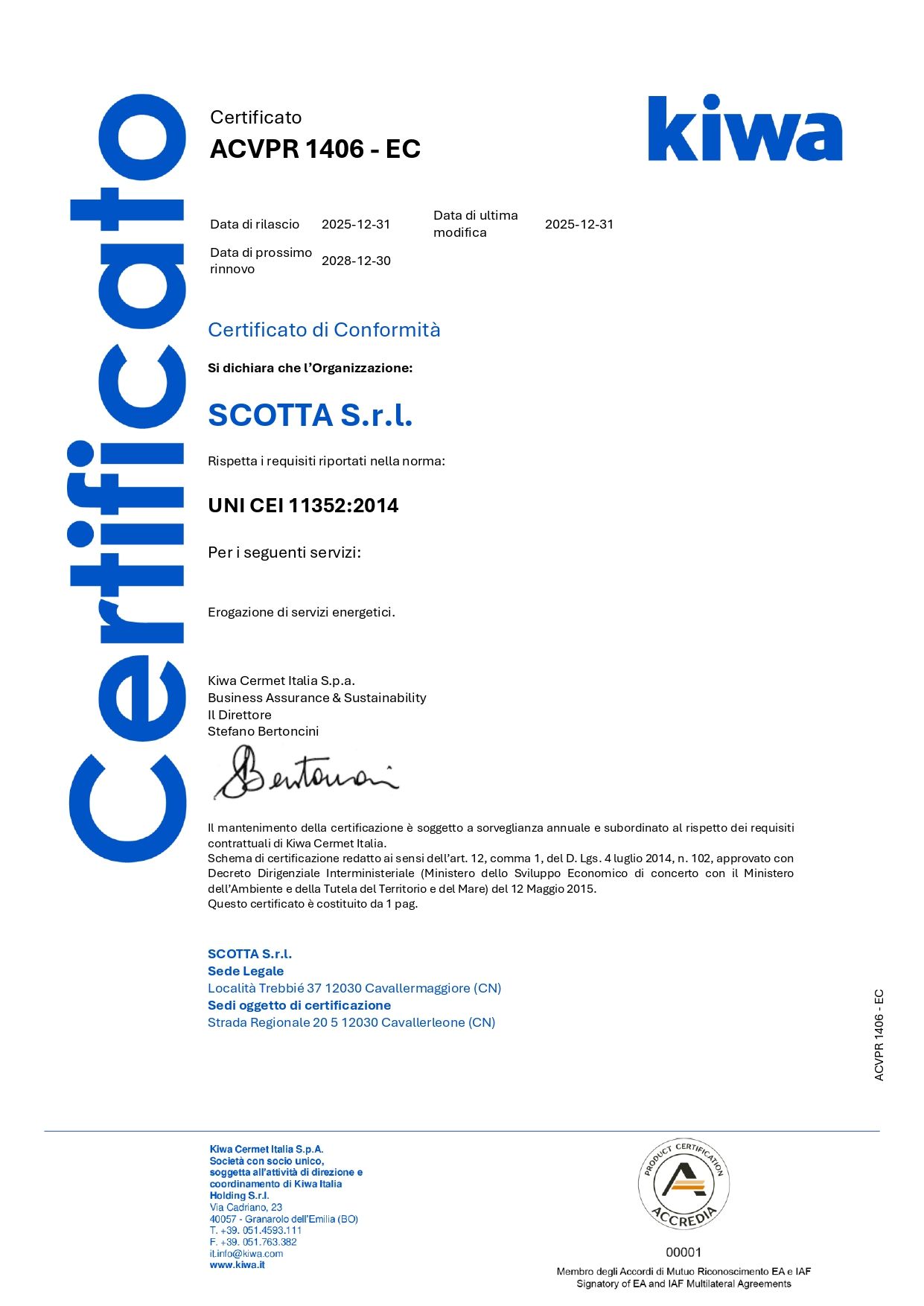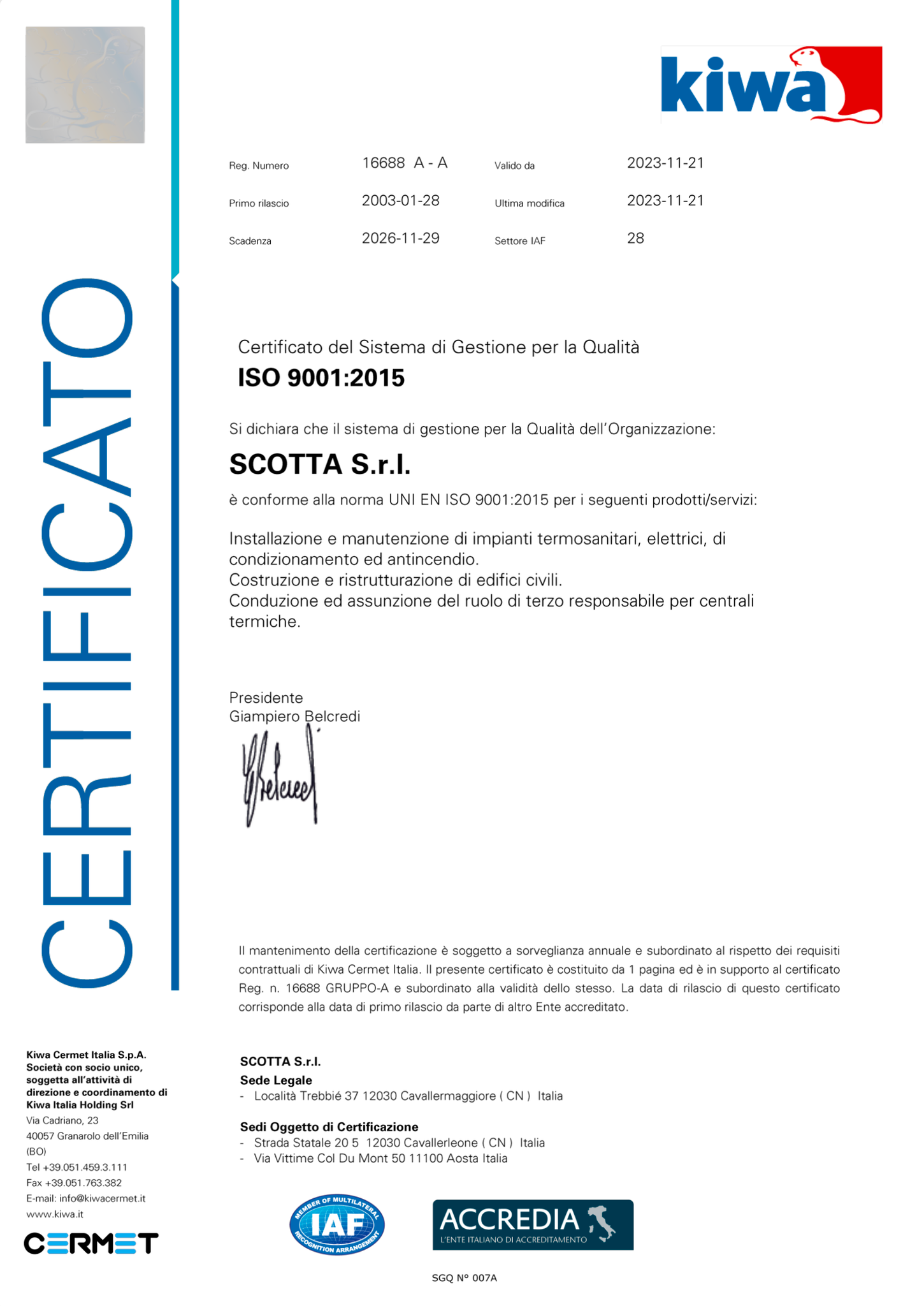Nell'ottica di migliorare la qualità dei servizi proposti, la società Scotta S.r.l. Italia ha disposto, a partire dal 2003, un Sistema di Gestione della Qualità ottenendo nel medesimo anno la certificazione di Qualità UNI EN ISO 9001:2000.